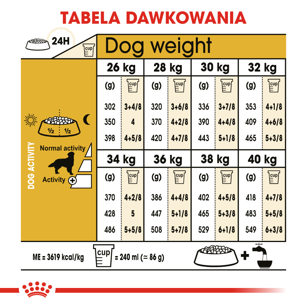 | Masa ciała psa | Aktywność Niska (g) | Aktywność Umiarkowana (g) | Aktywność Wysoka (g) |
