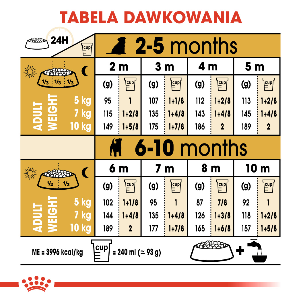 | Wiek psa (miesięcy) | Waga psa = 5 kg | Waga psa = 7 kg | Waga psa = 10 kg |