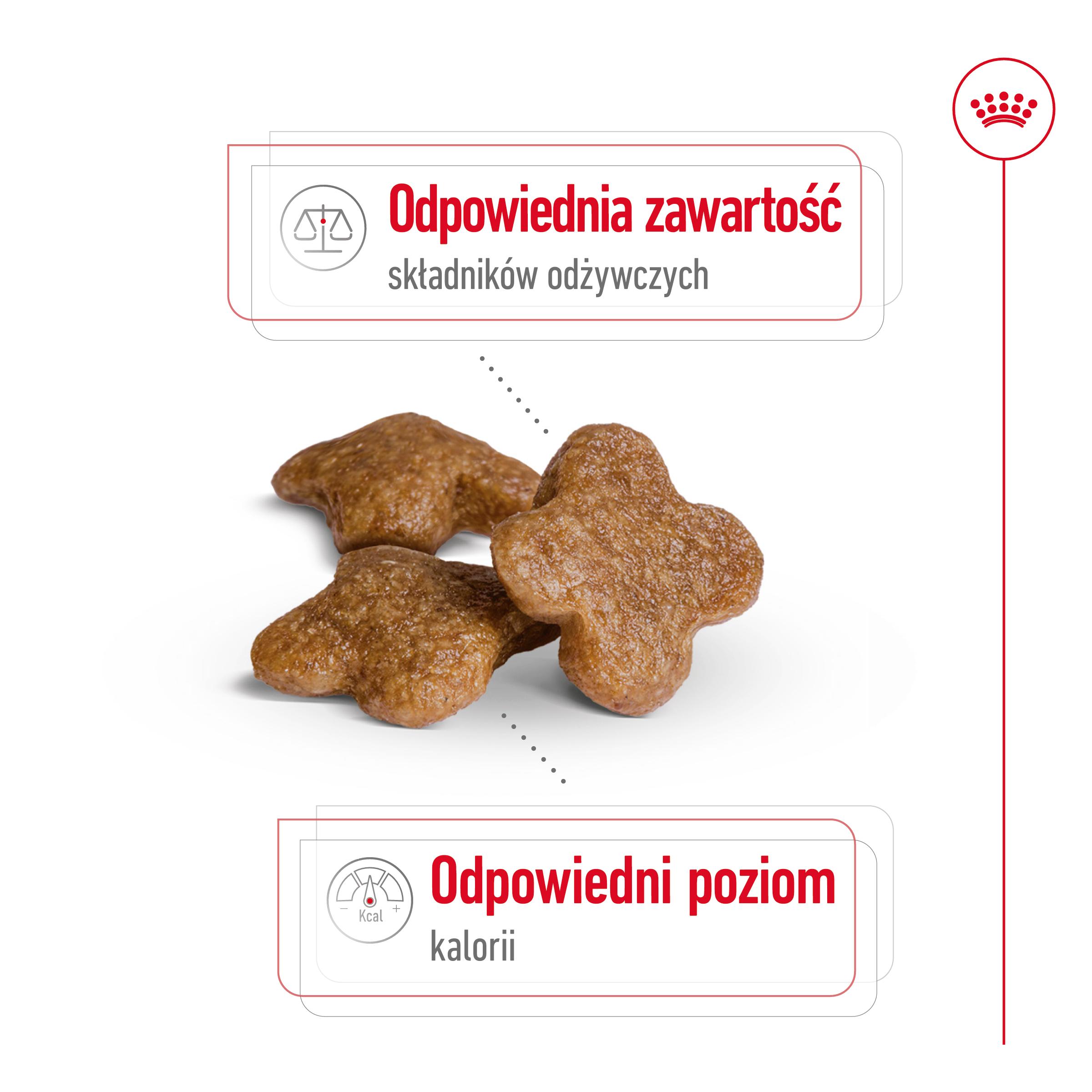 Dla psów ras małych powyżej 8 roku życia zaleca się karmę ROYAL CANIN® Mini Adult 8+. To pełnoporcjowa karma, o recepturze prawidłowo zbilansowanej pod względem składników pokarmowych i opracowanej specjalnie z uwzględnieniem szczególnych potrzeb psów dojrzałych. Karma przeznaczona dla dorosłych psów o masie ciała do 10 kg.