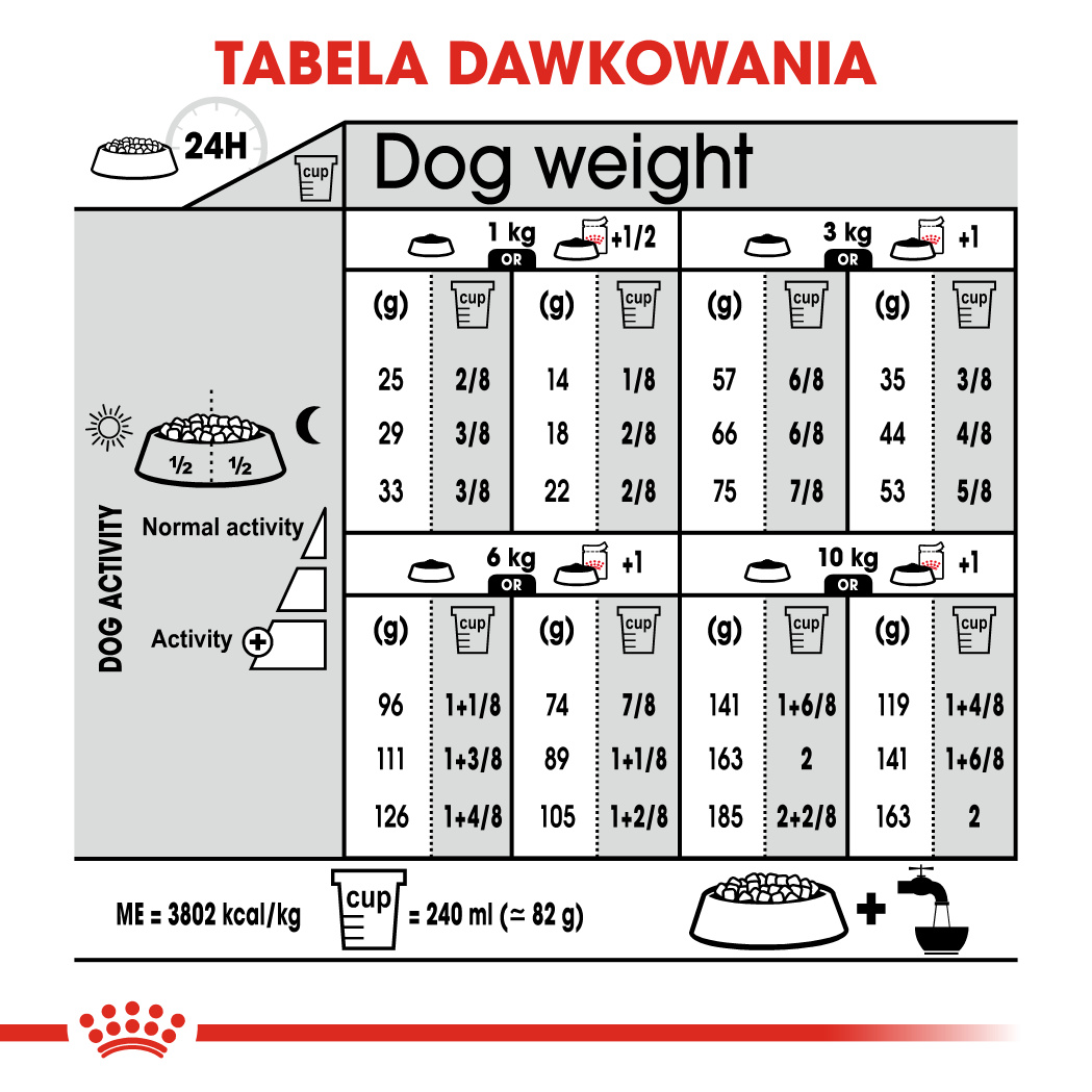 Niska aktywność (suchej karmy) Niska aktywność (mieszane karmienie) Normalna aktywność (suchej karmy) Normalna aktywność (mieszane karmienie) Wysoka aktywność (suchej karmy) Wysoka aktywność (mieszane karmienie)