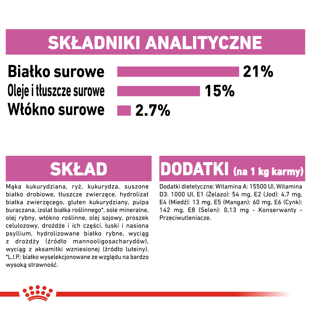 mąka kukurydziana, ryż, kukurydza, suszone białko drobiowe, tłuszcze zwierzęce, hydrolizat białka zwierzęcego, gluten kukurydziany, pulpa buraczana, izolat białka roślinnego*, sole mineralne, olej rybny, włókno roślinne, olej sojowy, proszek celulozowy, drożdże i ich części, łuski i nasiona psyllium, hydrolizowane białko rybne, wyciąg z drożdży (źródło mannooligosacharydów), wyciąg z aksamitki wzniesionej (źródło luteiny).