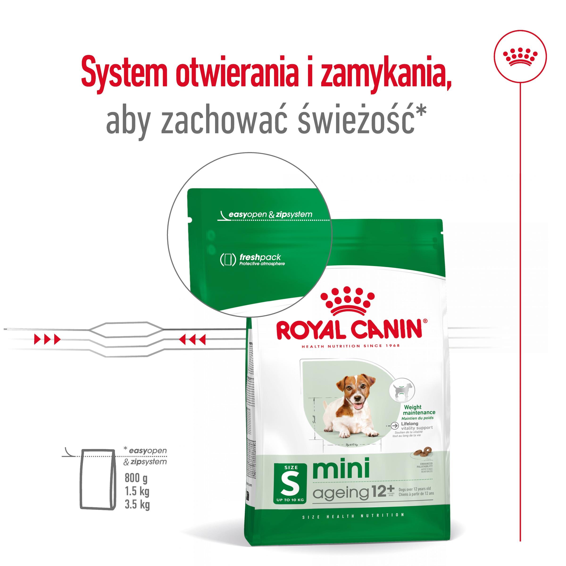 ROYAL CANIN® Mini Adult 12+ to pełnoporcjowa karma, o recepturze prawidłowo zbilansowanej pod względem składników pokarmowych i opracowanej specjalnie z uwzględnieniem szczególnych potrzeb starszych psów ras małych. Karma przeznaczona dla starszych psów ras małych (masa ciała do 10 kg, w wieku powyżej 12 lat).