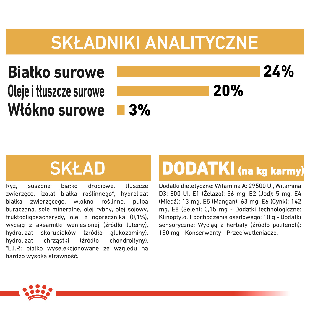ryż, suszone białko drobiowe, tłuszcze zwierzęce, izolat białka roślinnego*, hydrolizat białka zwierzęcego, włókno roślinne, pulpa buraczana, sole mineralne, olej rybny, olej sojowy, fruktooligosacharydy, olej z ogórecznika (0,1%), wyciąg z aksamitki wzniesionej (źródło luteiny), hydrolizat skorupiaków (źródło glukozaminy), hydrolizat chrząstki (źródło chondroityny).