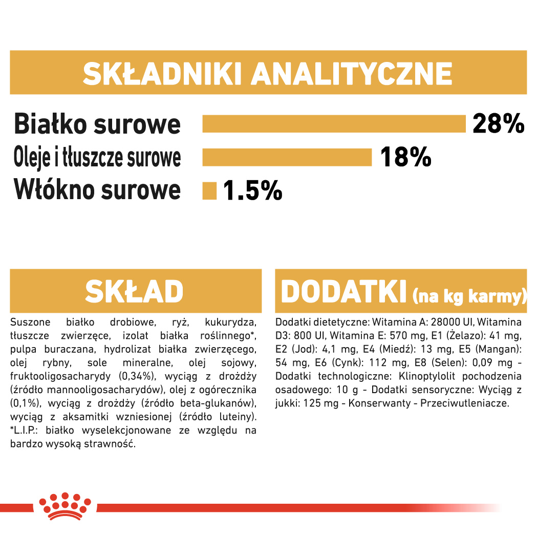 suszone białko drobiowe, ryż, kukurydza, tłuszcze zwierzęce, izolat białka roślinnego*, pulpa buraczana, hydrolizat białka zwierzęcego, olej rybny, sole mineralne, olej sojowy, fruktooligosacharydy (0,34%), wyciąg z drożdży (źródło mannooligosacharydów), olej z ogórecznika (0,1%), wyciąg z drożdży (źródło beta-glukanów), wyciąg z aksamitki wzniesionej (źródło luteiny).