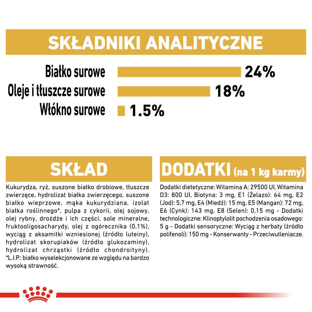 kukurydza, ryż, suszone białko drobiowe, tłuszcze zwierzęce, hydrolizat białka zwierzęcego, suszone białko wieprzowe, mąka kukurydziana, izolat białka roślinnego*, pulpa z cykorii, olej sojowy, olej rybny, drożdże i ich części, sole mineralne, fruktooligosacharydy, olej z ogórecznika (0,1%), wyciąg z aksamitki wzniesionej (źródło luteiny), hydrolizat skorupiaków (źródło glukozaminy), hydrolizat chrząstki (źródło chondroityny).