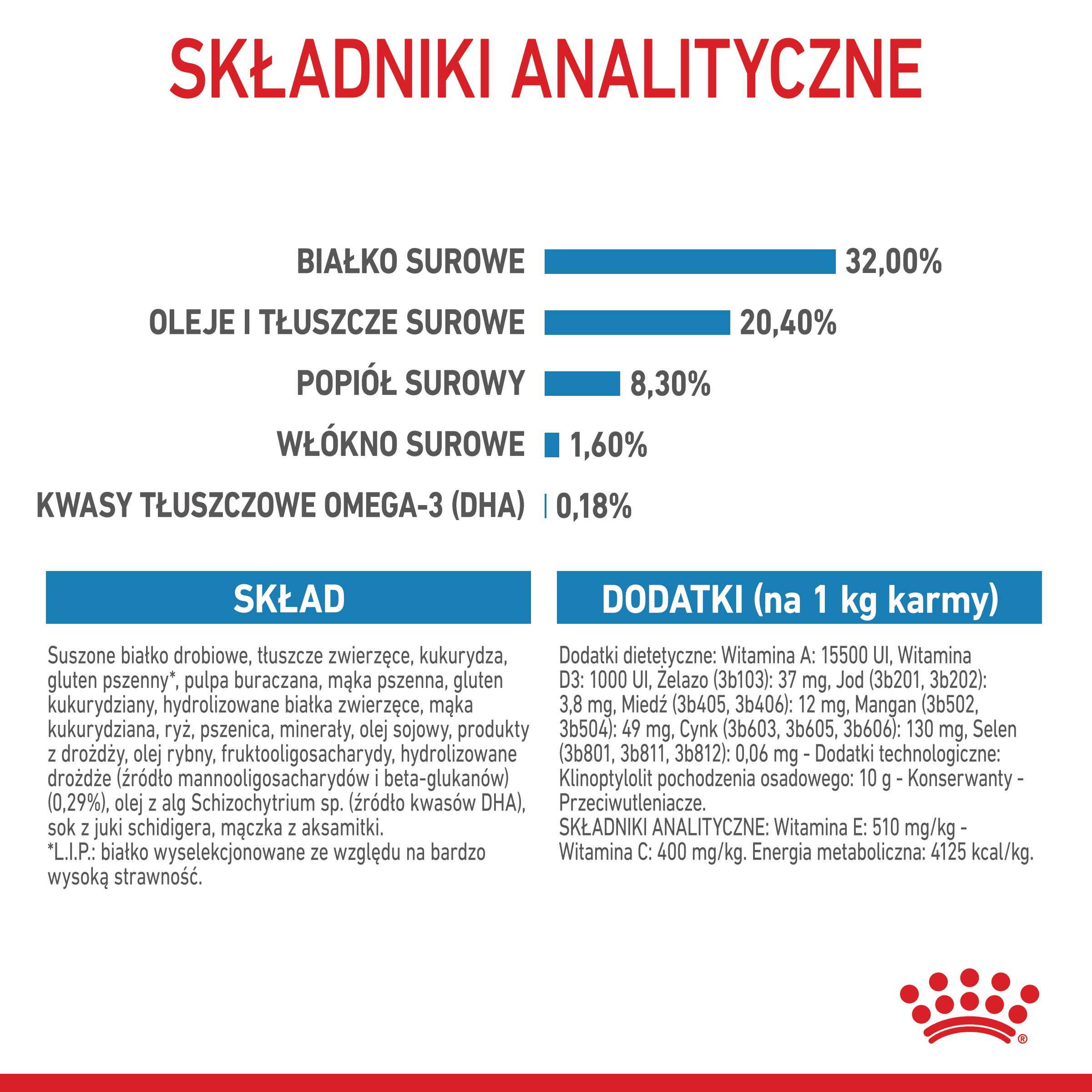 Białko surowe: 32,0% – Oleje i tłuszcze surowe: 20,0% – Popiół surowy: 8,2% – Włókno surowe: 1,7% – Kwasy tłuszczowe omega-3 (DHA): 0,17% – Witamina E: 500 mg/kg – Witamina C: 400 mg/kg. Energia metaboliczna: 4102 kcal/kg.
